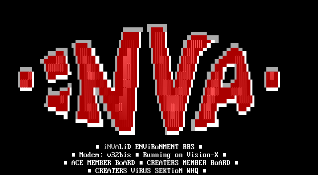 NVALiD ENViRoNMENT BBS Modem: v32bis Running on Vision-X ACE MEMBER BoARD CREATERS MEMBER BoARD CREATERS ViRUS SEKTioN WHQ