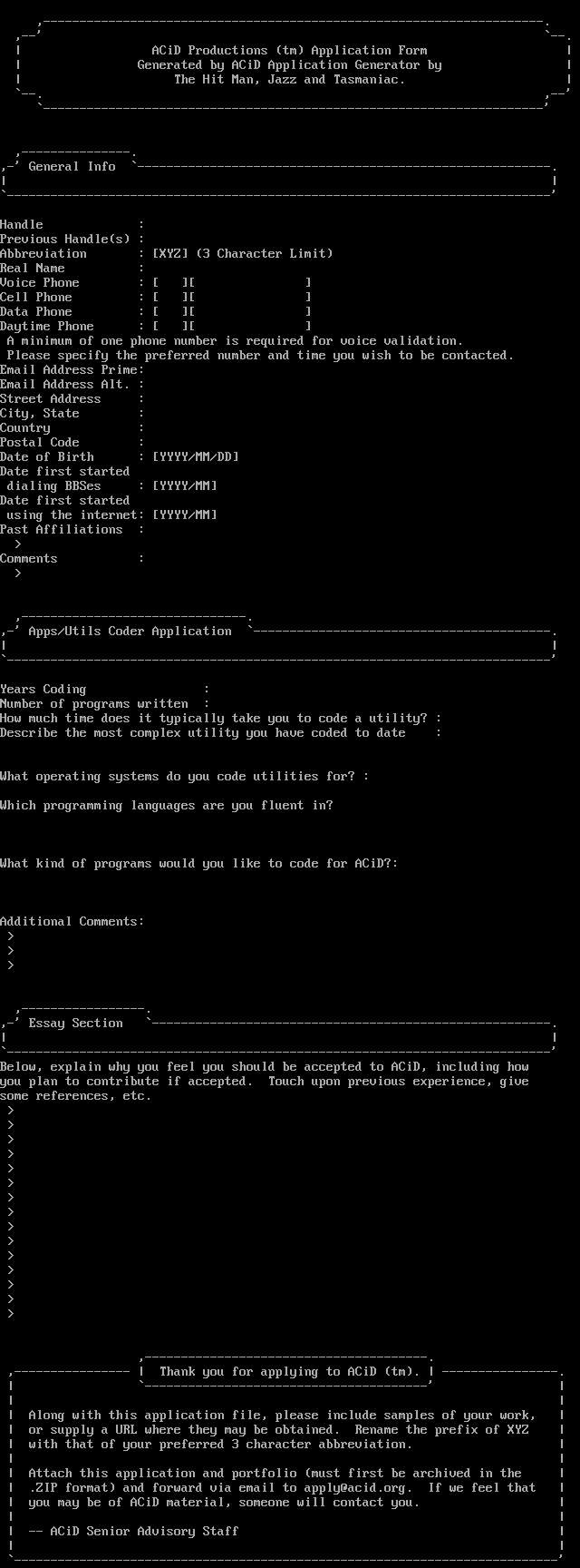 ,---------------- Thank you for applying to ACiD tm. ----------------.
