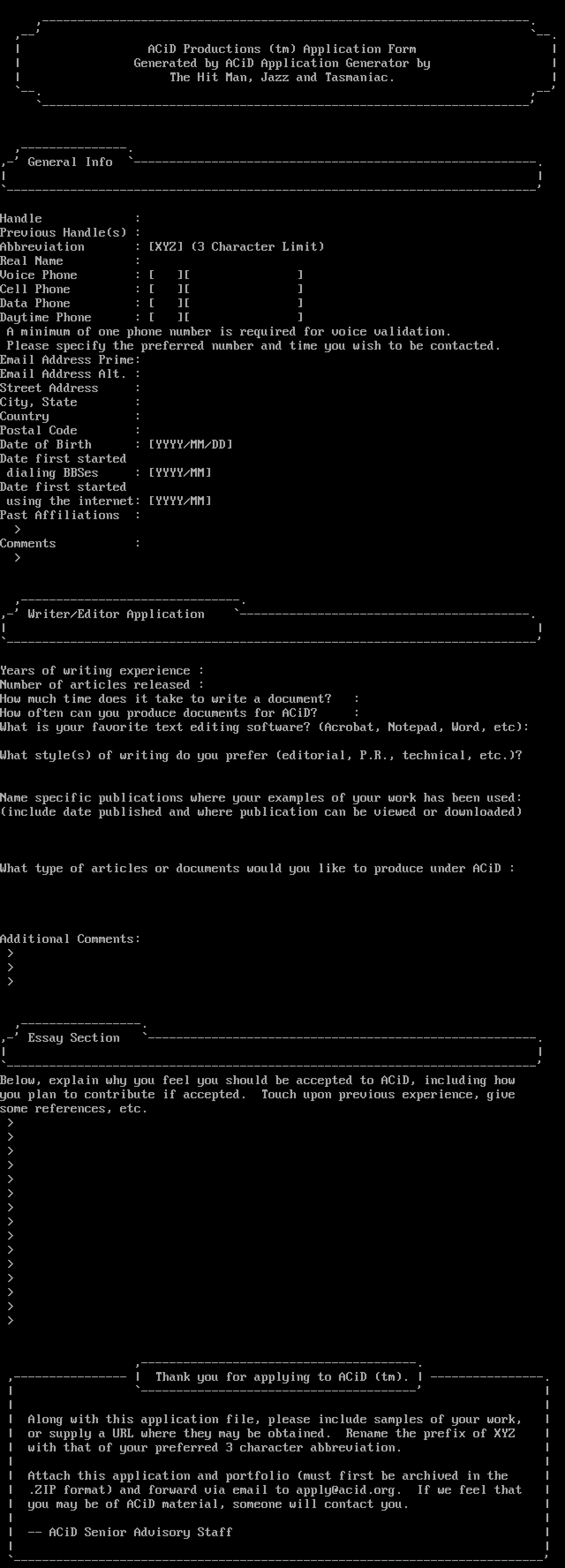 ,---------------- Thank you for applying to ACiD tm. ----------------.