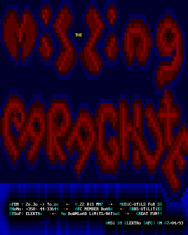 THE oPEN : 2o.3o - !o.oo -+- V.22 BiS MNP -+- MUSiC-UTiLS FoR SB PHoNo: +358- 44-33644 -+- AFC MEMBER BoARd -+- SBBS-UTiLiTiES SYSoP: ELEKTRo -+- No DoWNLoAD LiMiTS/RATioS -+- GREAT FUN!! ANSi BY ELEKTRo AFC ON 07/04/93
