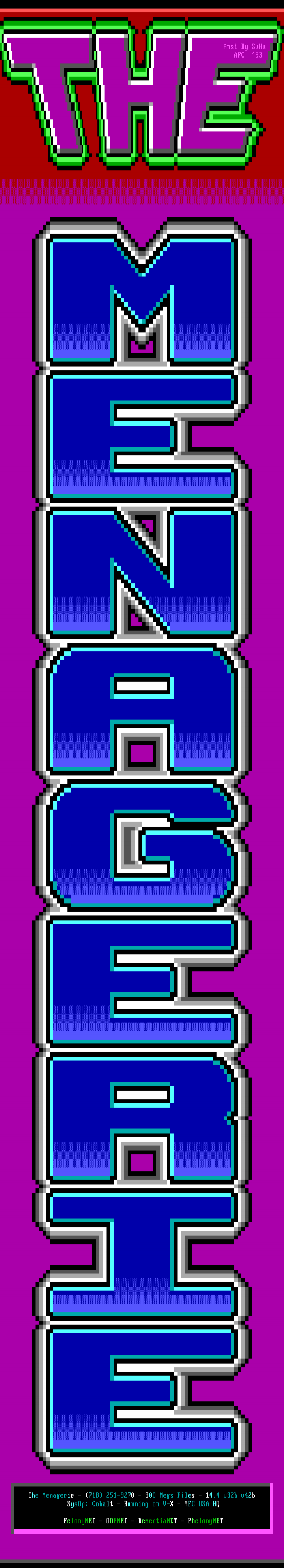The Menagerie - 718 251-9270 - 300 Megs Files - 14.4 v32b v42b SysOp: Cobalt - Running on V-X - AFC USA HQ FelonyNET - OOFNET - DementiaNET - PhelonyNET