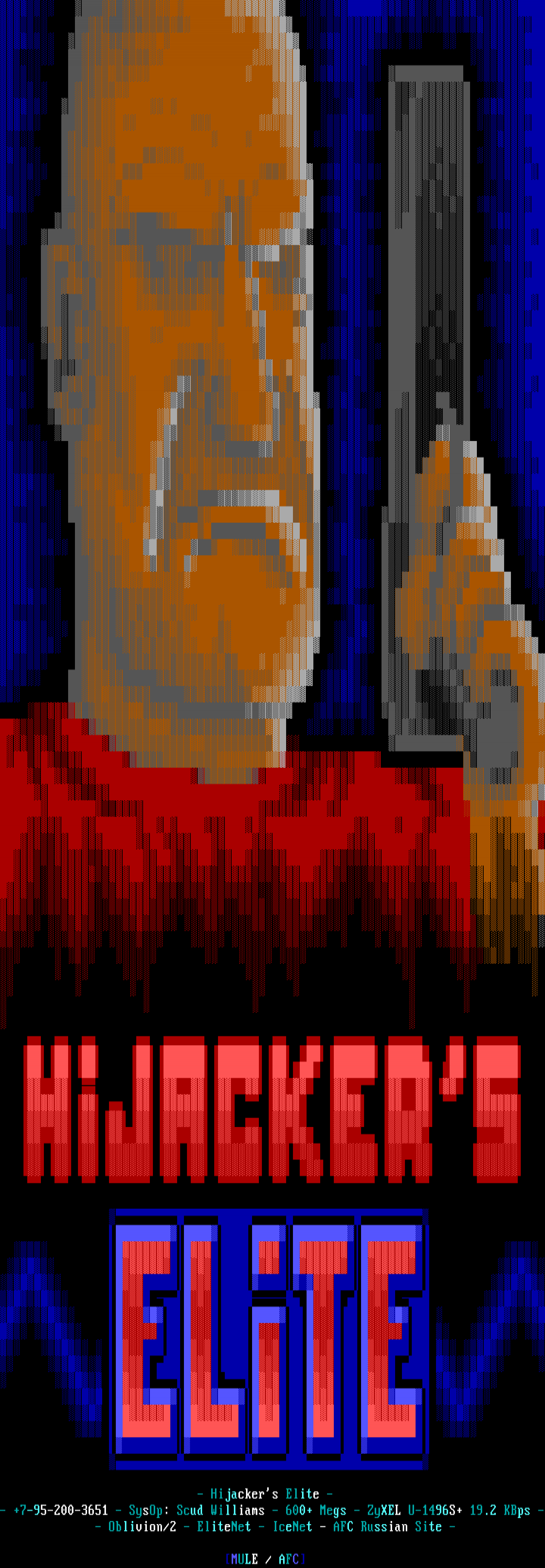 - +7-95-200-3651 - SysOp: Scud Williams - 600+ Megs - ZyXEL U-1496S+ 19.2 KBps - - Oblivion/2 - EliteNet - IceNet - AFC Russian Site -