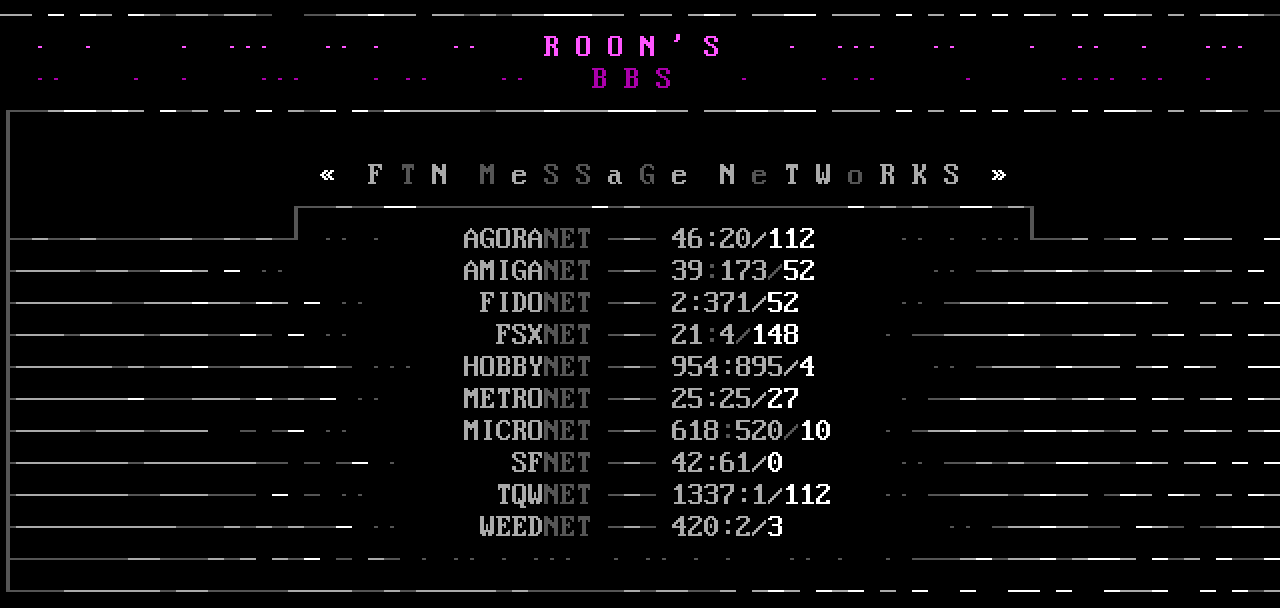FIDONET 2:371/52 FSXNET 21:4/148 HOBBYNET 954:895/4 METRONET 25:25/27 MICRONET 618:520/10 SFNET 42:61/0 TQWNET 1337:1/112 WEEDNET 420:2/3