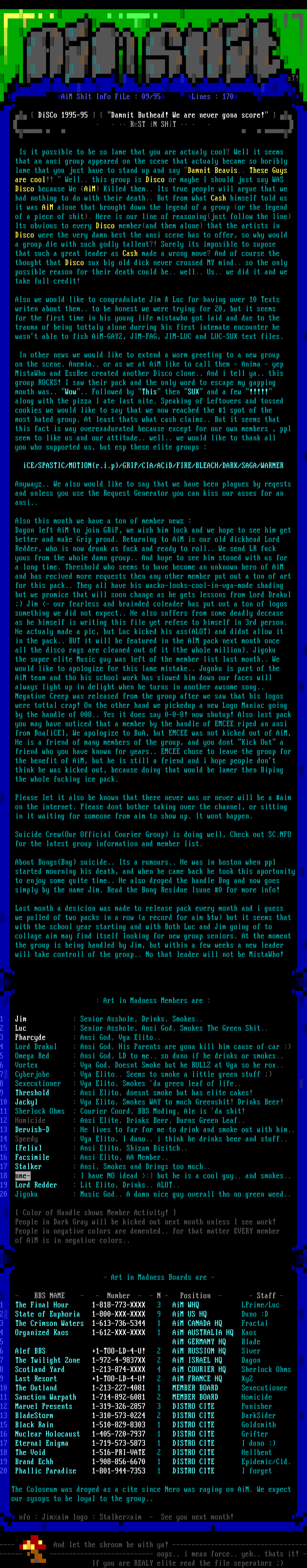 DiSCo 1995-95 Damnit Buthead! We are never gona score! ReST iN SHiT Is it possible to be so lame that you are actualy cool? Well it seems that an ansi group appeared on the scene that actualy became so horibly lame that you just have to stand up and say Damnit Beavis.. These Guys are cool!! Well.. this group is Disco or maybe I should just say WAS Disco because We AiM Killed them.. Its true people will argue that we had nothing to do with their death.. But from what Cash himself told us it was AiM alone that brought down the legend of a group or the legend of a piece of shit. Here is our line of reasoningjust follow the line Its obvious to every Disco memberand them alone that the artists in Disco were the very damn best the ansi scene has to offer, so why would a group die with such godly tallent?! Surely its imposible to supose that such a great leader as Cash made a wrong move? And of course the thought that Disco sux big old dick never crossed MY mind.. so the only possible reason for their death could be.. well.. Us.. we did it and we take full credit! Also we would like to congradulate Jim Luc for having over 10 Texts writen about them.. to be honest we were trying for 20, but it seems for the first time in his young life mistawho got laid and due to the trauma of being tottaly alone durring his first intemate encounter he wasnt able to fish AiM-GAY2, JIM-FAG, JIM-LUC and LUC-SUX text files. In other news we would like to extend a worm greeting to a new group on the scene. Anemia.. or as we at AiM like to call them - Anima - yep MistaWho and EssBee created another Disco clone.. And i tell ya.. this group ROCKS! I saw their pack and the only word to escape my gapping mouth was.. Wow.. Followed by This then SUX and a few !!!!! along with the pizza I ate last nite. Speaking of Leftovers and tossed cookies we would like to say that we now reached the 1 spot of the most hated group. At least thats what cash claims.. But it seems that this fact is way overexadurated because except for our own members , ppl seem to like us and our attitude.. well.. we would like to thank all you who supported us, but esp these elite groups : iCE/SPASTIC/MOTIONr.i.p/GRIP/CIA/ACiD/FIRE/BLEACH/DARK/SAGA/WARNER Anywayz.. We also would like to say that we have been plagues by reqests and unless you use the Request Generator you can kiss our asses for an ansi.. Also this month we have a ton of member newz : Dagon left AiM to join GRiP, we wish him luck and we hope to see him get better and make Grip proud. Returning to AiM is our old dickhead Lord Redder, who is now drunk as fuck and ready to roll.. We send LR fuck yous from the whole damn group.. And hope to see him stoned with us for a long time. Threshold who seems to have become an unknown hero of AiM and has recived more requests then any other member put out a ton of art for this pack.. They all have his wacko-looks-cool-in-vga-mode shading but we promice that will soon change as he gets lessons from Lord Drakul Jim - our fearless and brainded coleader has put out a ton of logos something we did not expect.. He also suffers from some deadly decease as he himself is writing this file yet refese to himself in 3rd person. He actualy made a pic, but Luc kicked his assALOT and didnt allow it in the pack.. BUT it will be featured in the AIM pack next month once all the disco rags are cleaned out of it the whole million. Jigoku the super elite Music guy was left of the member list last month.. We would like to apologize for this lame mistake.. Jugoku is part of the AiM team and tho his school work has slowed him down our faces will always light up in delight when he turns in another awsome song.. Negative Creep was released from the group after we saw that his logos were tottal crap! On the other hand we pickedup a new Logo Maniac going by the handle of 008.. Yes it does say 0-0-8! now shutup! Also last pack you may have noticed that a member by the handle of EMCEE riped an ansi from BoaiCE, We apologize to BoA, but EMCEE was not kicked out of AiM, He is a friend of many members of the group, and you dont Kick Out a friend who you have known for years.. EMCEE chose to leave the group for the benefit of AiM, but he is still a friend and i hope people dont think he was kicked out, because doing that would be lamer then Riping the whole fucking ice pack. Please let it also be known that there never was or never will be a aim on the internet. Please dont bother taking over the channel, or sitting in it waiting for someone from aim to show up. It wont happen. Suicide CrewOur Official Courier Group is doing well, Check out SC.NFO for the latest group information and member list. About BongsBng suicide.. Its a rumours.. He was in boston when ppl started mourning his death, and when he came back he took this aportunity to enjoy some quite time.. He also droped the handle Bng and now goes simply by the name Jim. Read the Bong Residue Isuue 0 for more info! Last month a desicion was made to release pack every month and i guess we pulled of two packs in a row a record for aim btw but it seems that with the school year starting and with Both Luc and Jim going of to collage aim may find itself looking for new group seniors. At the moment the group is being handled by Jim, but within a few weeks a new leader will take controll of the group.. No that leader will not be MistaWho! : Art in Madness Members are : 1 Jim : Senior Asshole, Drinks, Smokes.. 2 Luc : Senior Asshole, Ansi God, Smokes The Green Shit.. 3 Pharcyde : Ansi God, Vga Elito.. 4 Lord Drakul : Ansi God, His Parents are gona kill him cause of car : 5 Omega Red : Ansi God, LD to me.. so duno if he drinks or smokes.. 6 Vortex : Vga God, Doesnt Smoke but he RULLZ at Vga so he rox.. 7 Cyberjobe : Vga Elito.. Seems to smoke a little green stuff 8 Sexecutioner : Vga Elito, Smokes da green leaf of life.. 9 Threshold : Ansi Elito, doesnt smoke but has elite cakes! 10 Jackyl : Vga Elito, Smokes WAY to much Greenshit! Drinks