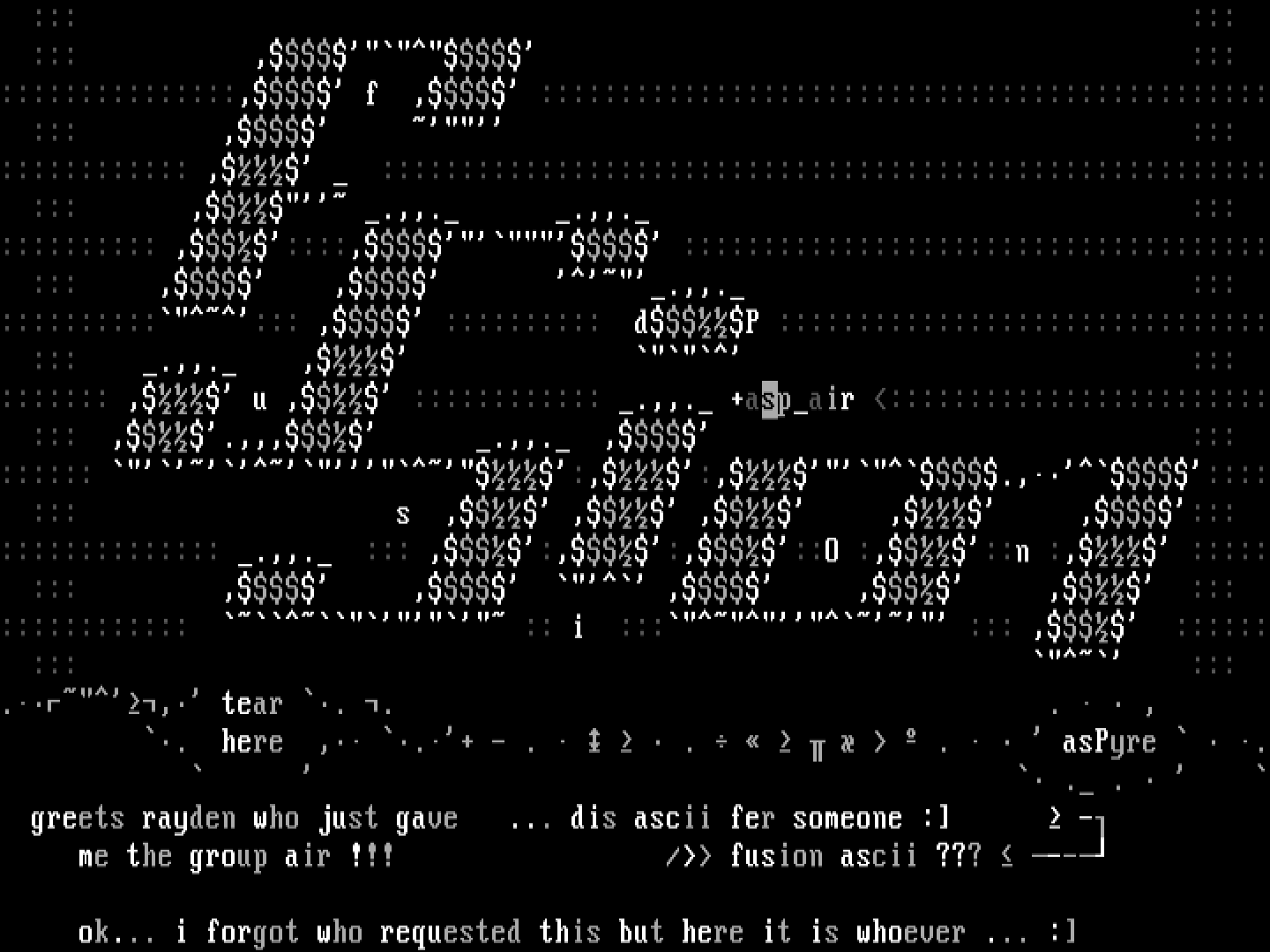 . here , .+ - . . . asPyre . . . greets rayden who just gave ... dis ascii fer someone : -