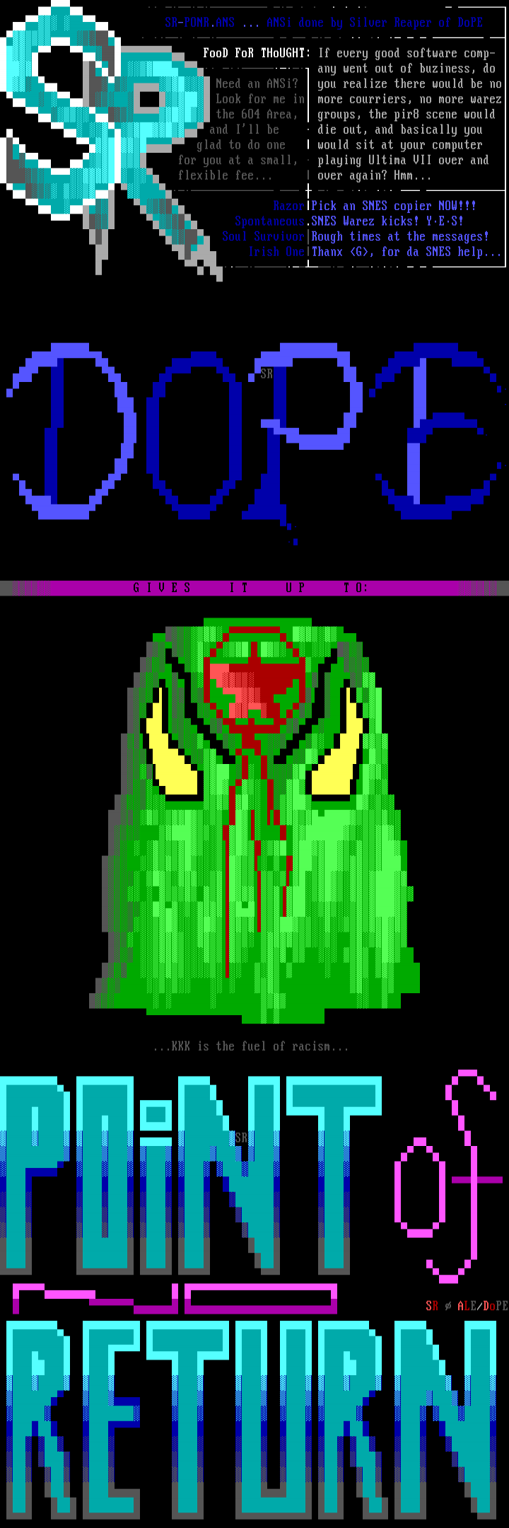 SR-PONR.ANS ... ANSi done by Silver Reaper of DoPE FooD FoR THoUGHT: If every good software comp- any went out of buziness, do Need an ANSi? you realize there would be no Look for me in more courriers, no more warez the 6O4 Area, groups, the pir8 scene would and Ill be die out, and basically you glad to do one would sit at your computer for you at a small, playing Ultima VII over and flexible fee... over again? Hmm... RazorPick an SNES copier NOW!!! Spontaneous.SNES Warez kicks! YES! Soul SurvivorRough times at the messages! Irish OneThanx G, for da SNES help...