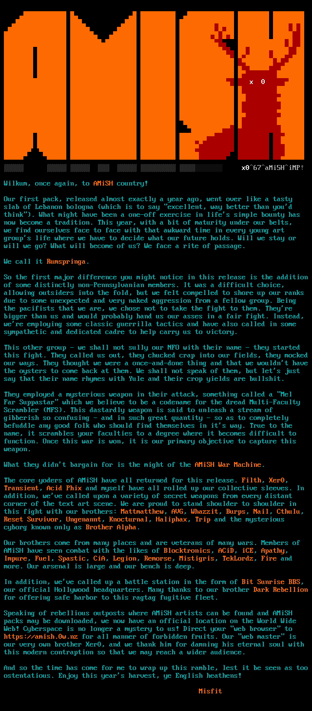 AMiSH have seen combat with the likes of Blocktronics, ACiD, iCE, Apathy,