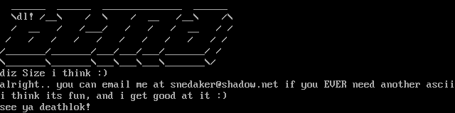 alright.. you can email me at snedaker@shadow.net if you EVER need another asciii think its fun, and i get good at it :