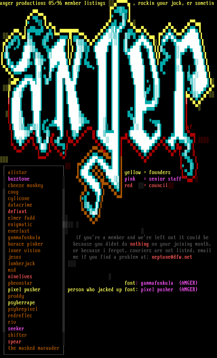 anger productions 05/96 member listings , rockin your jock, er sometin