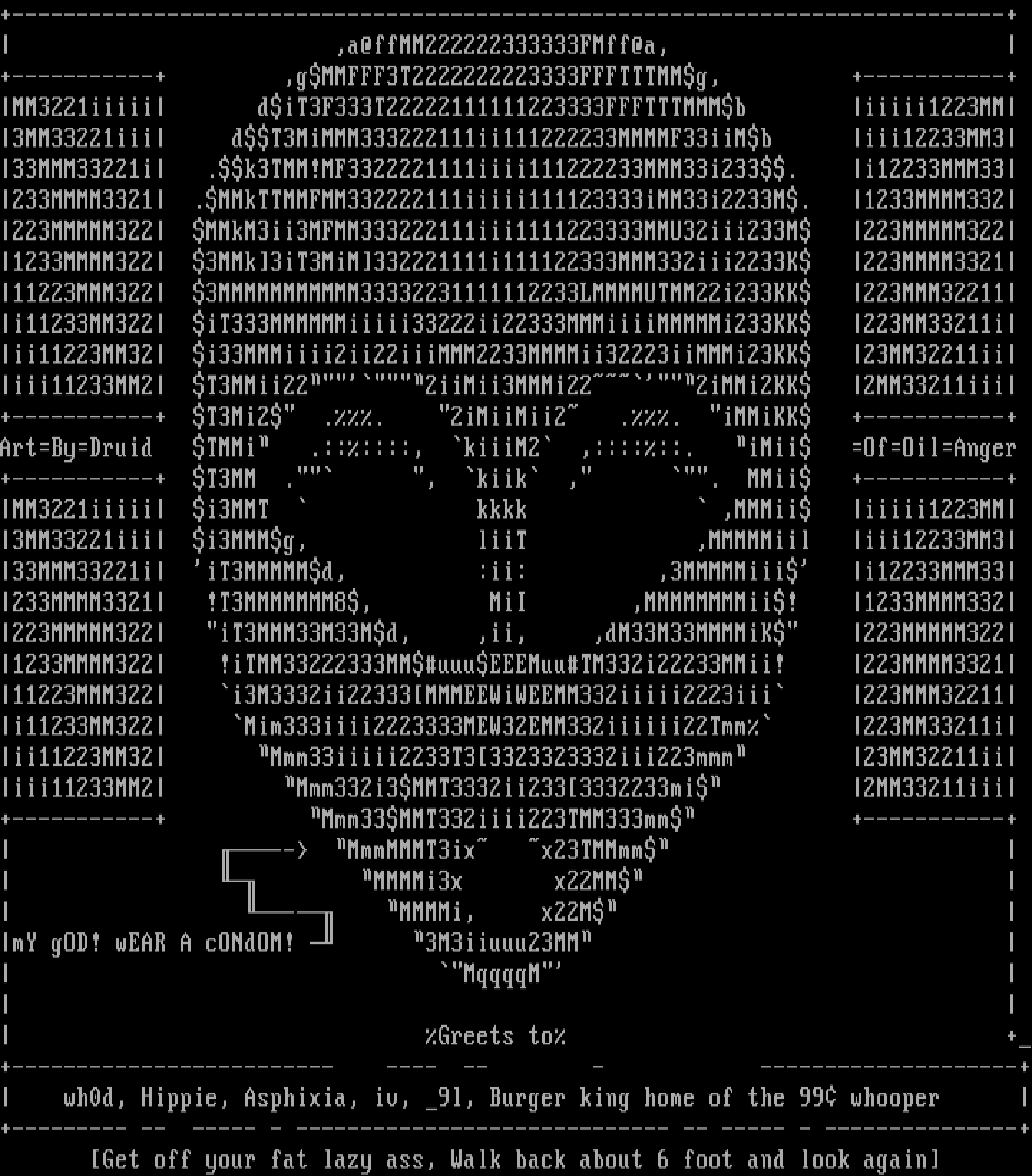 Greets to ++------------------------- ---- -- - --------------------+ wh0d, Hippie, Asphixia, iv, 9l, Burger king home of the 99 whooper +--------- -- ----- - ----------------------------- -- ----- - ---------------+ Get off your fat lazy ass, Walk back about 6 foot and look again