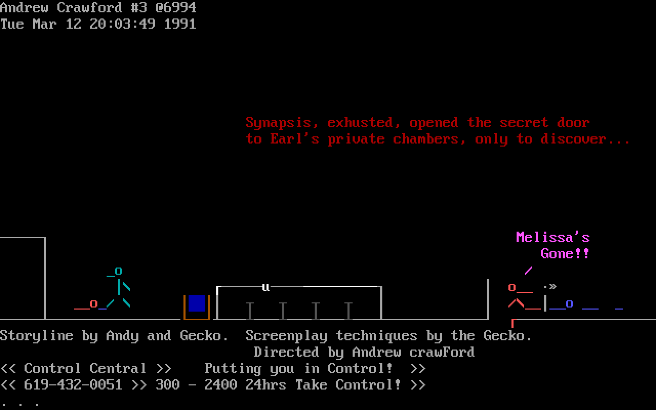 EarlsBar.o o/o /uThat night, with Melissa asleep in one of Earls rooms, Synapsis recounted to Earlhow well the Evenings adventure went. o / o/ u uc / u u/ / o o / / o u u uToAdven-ture u u c / ou u / o/ o / /o / o o/ o / / o The conversation turned to adiscussion about weapons andbattle stratagies. Synapsiswas particually interested in Earls favorate weapon,Merle, his Battl e Axe. o o / / o / o o / / o o/ / o o / / / o / o / o o / u u c u u u / / o o / / o A Pounding was Heard at the Door!!/Pound..... Pound... /It must be Lord Alfrads Elite Soilders Pound ... Here toadvence hisdeath!!POUND...advenge POUND.../POUND... Theyve almost broken the door, hidewhile I hold them offPOUND!!! /o/ o POUND!!! / / oPOUND!!!!!!!!POUND!!!! !!!!o o/ Synapsis used the F orce to make himselfinvisiblehmmmmmmmmmhmhmmmmmmmmmhmmmmmmmmm mh h h h o// //o/o// / /x O/ O / O / / / o O/ /o o o o/ o /x o / / Ahh,Earls days of batt le were comingback to him. o / / x / / o o// o // o x / / / o / He recalled the days where people feared Earl the Mighty One / /ox / /x/o / / o / / o o o / /x/ o / /x/ /x o/ //x/ / o/ / x o o/ / o / o / o / o / / / / o / / o o / o/ / o / o // o// o o / /Then, the Invisible Synapsis noticed more solidersentering from t he back door. / o* o / / o xo / o / o /* / * o / o / / / o / x / o / o / / */ o / x x x/ / x / x x/ x o / / o / / o // Oww! / o / Oww / * / o / / o / o o / o /o / * / o / /o / o / / / / / o /Hehe*/ o / / / o / o o / / / o / o / / / / / o / / o o o o o o o / / * / o / // o / / / / * / o / / o/ / / / / * / o / ooThere must besomething holdingthe ax / / / * / o /o o / o / v v v v v v v v v v v v . . . . Synapsis, exhusted, opened the secret doorto Earls private chambers, /o // o only to discover.../MelissasGone!!Storyline by Andy and Gecko. Screenplay techniques by the Gecko.Directed by Andrew crawFord
