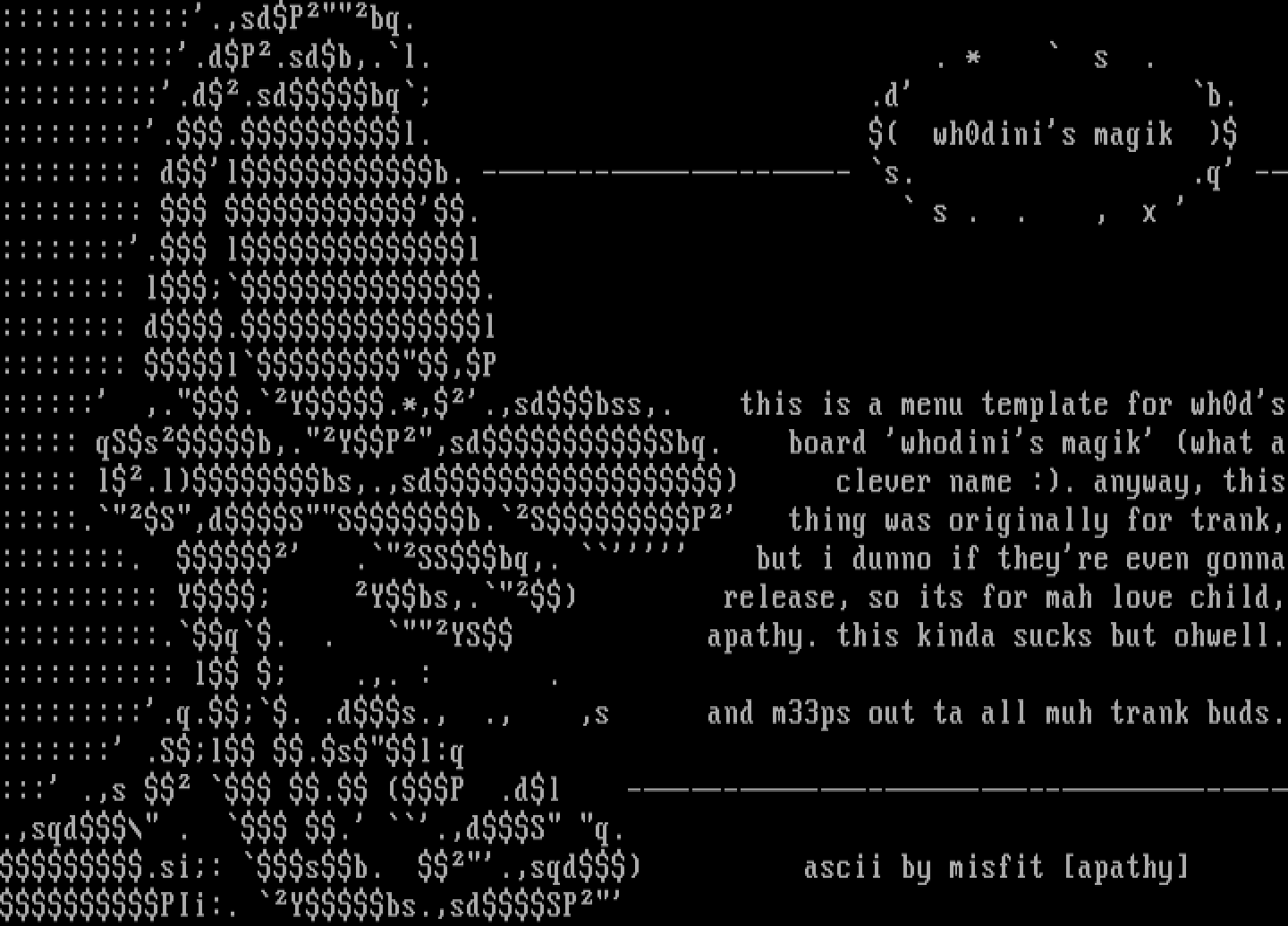 :::::: ,..Y.*,.,sdbss,. this is a menu template for wh0ds::::: qSsb,.YP,sdSbq. board whodinis magik what a::::: l.lbs,.,sd clever name :. anyway, this:::::.S,dSSb.SP thing was originally for trank,::::::::. .SSbq,. but i dunno if theyre even gonna:::::::::: Y Ybs,. release, so its for mah love child,::::::::::.q. . YS apathy. this kinda sucks but ohwell.::::::::::: l .,. : .