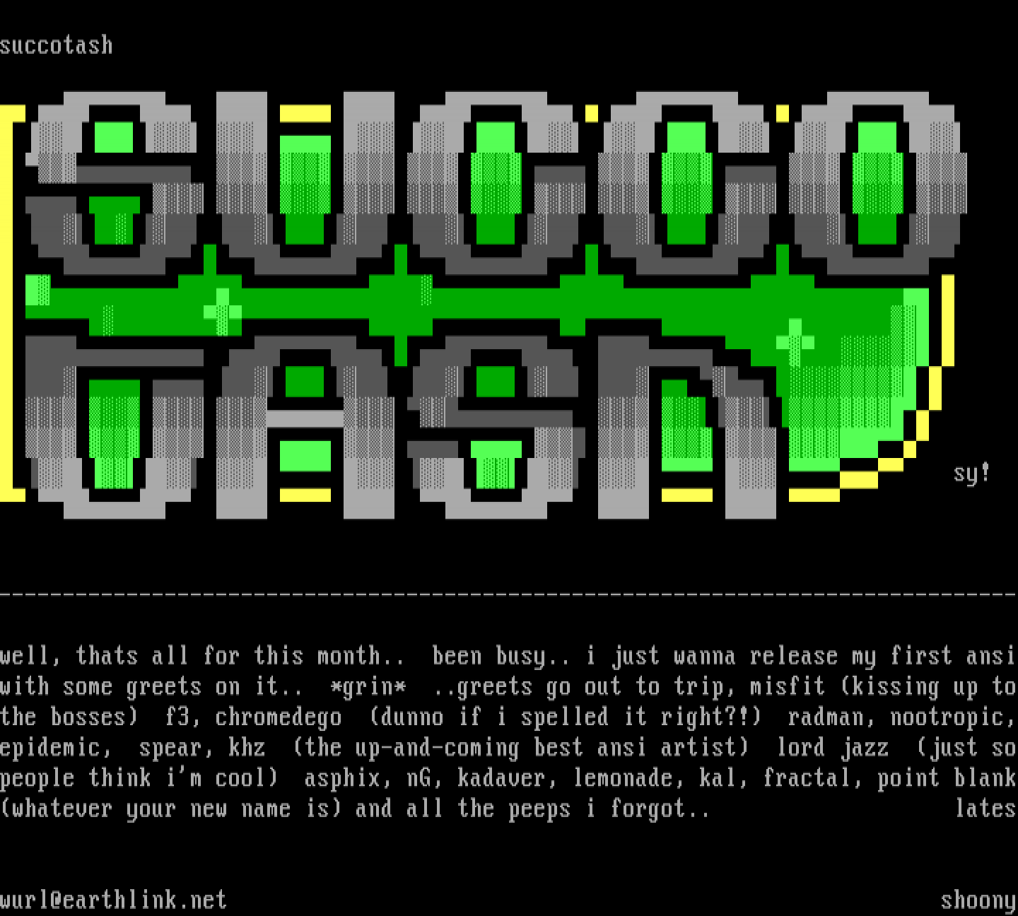 well, thats all for this month.. been busy.. i just wanna release my first ansiwith some greets on it.. *grin* ..greets go out to trip, misfit kissing up tothe bosses f3, chromedego dunno if i spelled it right?! radman, nootropic,epidemic, spear, khz the up-and-coming best ansi artist lord jazz just sopeople think im cool asphix, nG, kadaver, lemonade, kal, fractal, point blankwhatever your new name is and all the peeps i forgot.. lates
