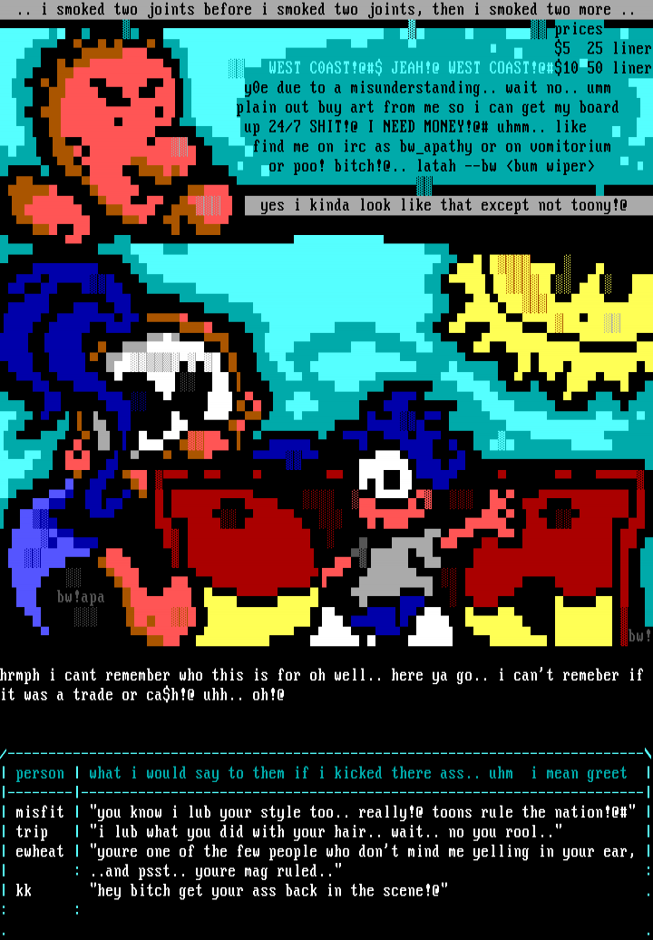 /------------------------------------------------------------------------------ person what i would say to them if i kicked there ass.. uhm i mean greet ----------------------------------------------------------------------------- misfit you know i lub your style too.. really!@ toons rule the nation!@ trip i lub what you did with your hair.. wait.. no you rool.. ewheat youre one of the few people who dont mind me yelling in your ear, : ..and psst.. youre mag ruled.. : kk hey bitch get your ass back in the scene!@ .: :