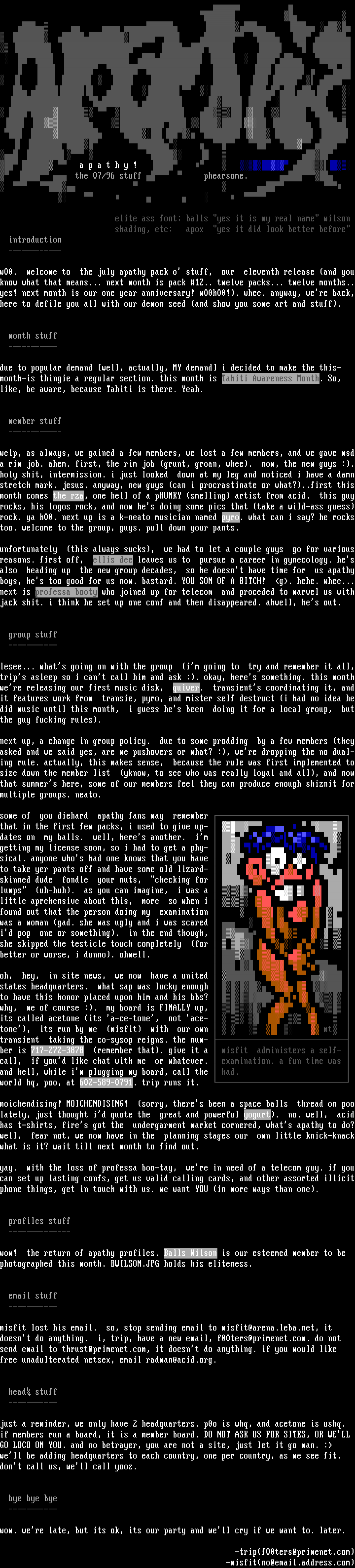w00. welcome to the july apathy pack o stuff, our eleventh release and youknow what that means... next month is pack 12.. twelve packs... twelve months..yes! next month is our one year anniversary! w00h00!. whee. anyway, were back,here to defile you all with our demon seed and show you some art and stuff.