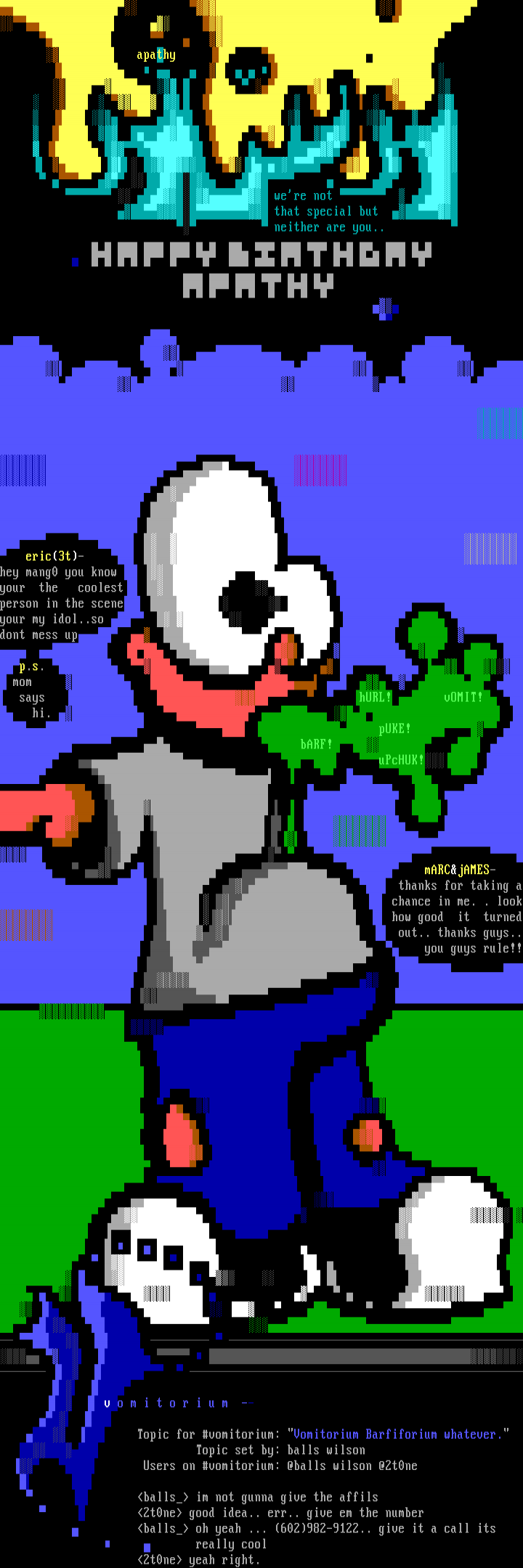 eric3t- hey mang0 you know your the coolest person in the scene your my idol..so dont mess up p.s. mom says hURL! vOMIT! hi. pUKE! bARF! uPcHUK! mARCjAMES-