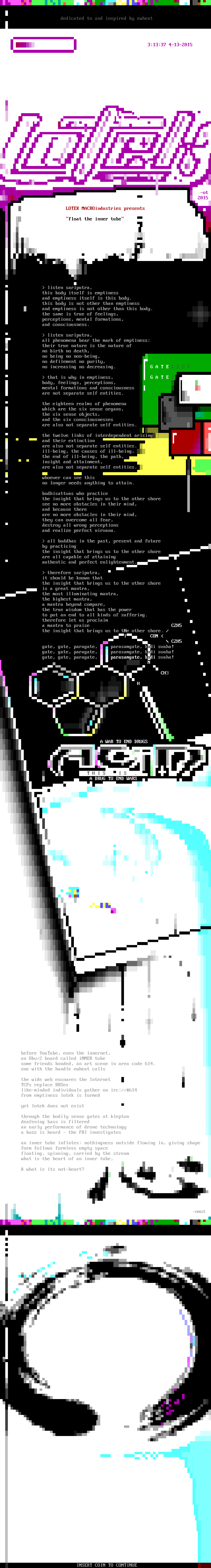 A WAR TO END DRUGS T H I S I S . A DRUG TO END WARS before YouTube, even the innernet, an Obv/2 board called iNNER tube some friends bonded, an art scene in area code 614.one with the handle ewheat calls the wide web ensnares the Internet TCPs replace BBSeslike-minded individuals gather on irc://614from emptiness lotek is formed yet lotek does not exist through the bodily sense gates at klepton deafening bass is filtered an early performance of drone technologya buzz is heard - the FBI investigatesan inner tube inflates: nothingness outside flowing in, giving shapeform follows formless empty spacefloating, spinning, carried by the streamwhat is the heart of an inner tube, what is its not-heart? -omot