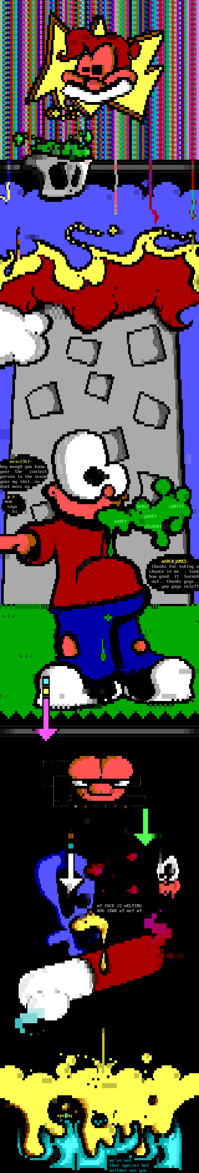 // eric3t- hey mang0 you know your the coolest person in the scene your my idol..so dont mess up p.s. mom says hURL! vOMIT! hi. pUKE! bARF! uPcHUK! mARCjAMES-