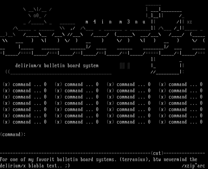 ----------------------------------------------------------cut---------------- For one of my favorit bulletin board systems. terraniux, btw nevermind the