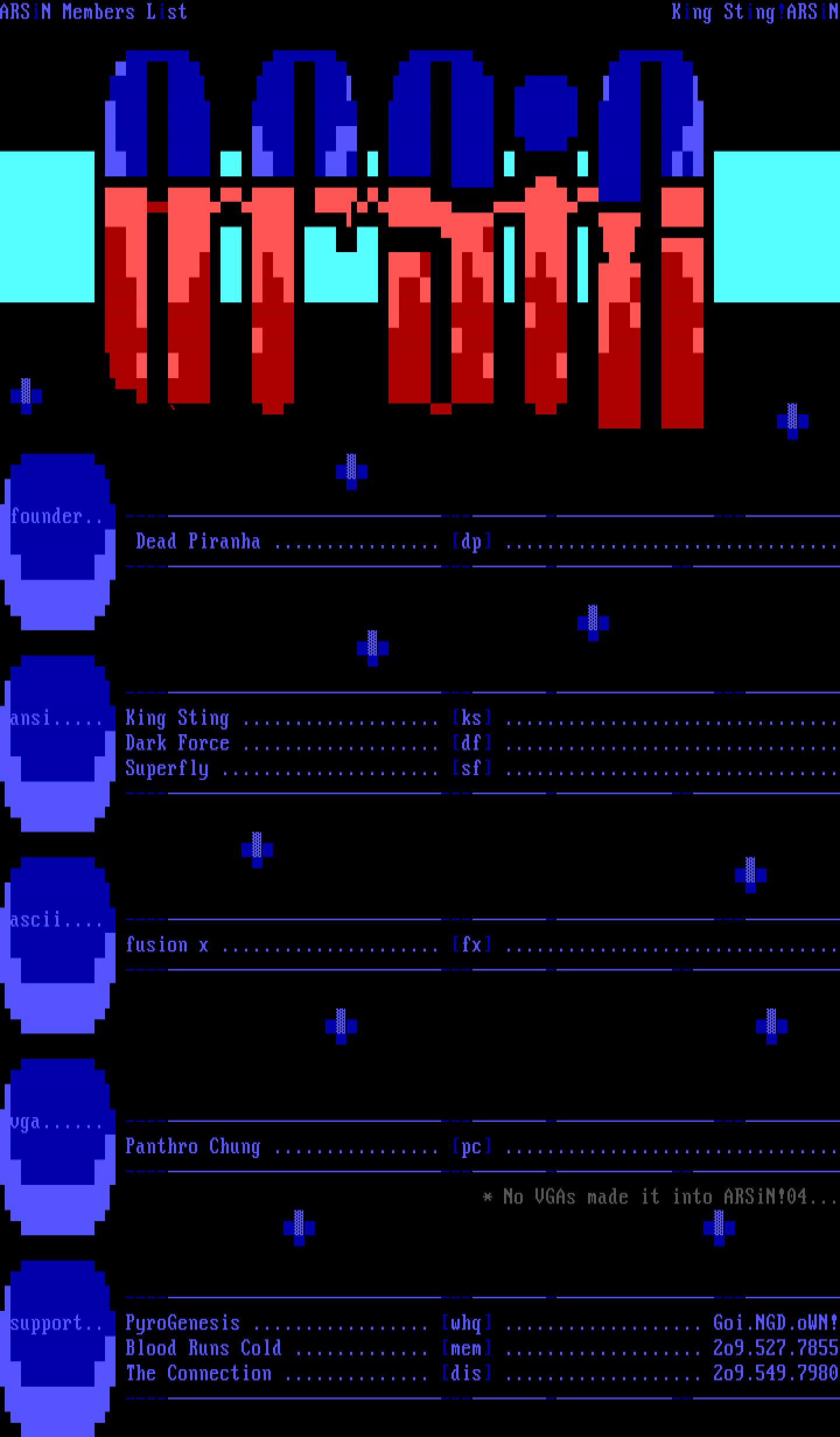 -----------ansi..... King Sting ................... ks ................................ Dark Force ................... df ................................ Superfly ..................... sf ................................ ----------