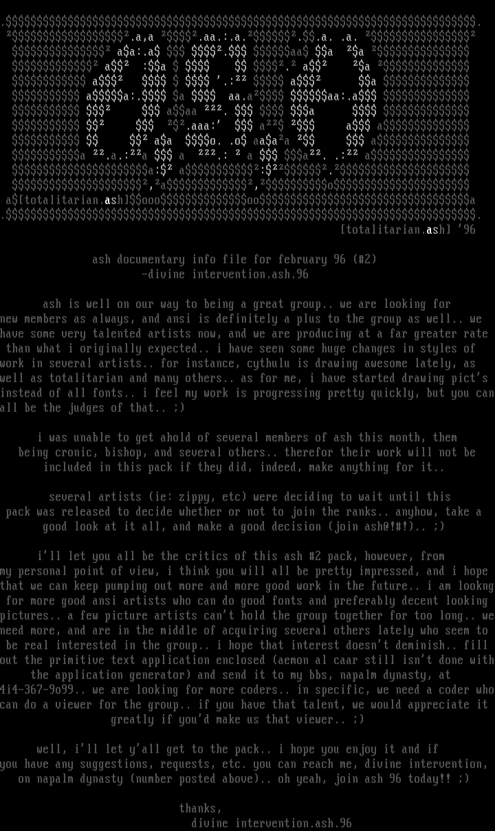 that we can keep pumping out more and more good work in the future.. i am lookng for more good ansi artists who can do good fonts and preferably decent looking