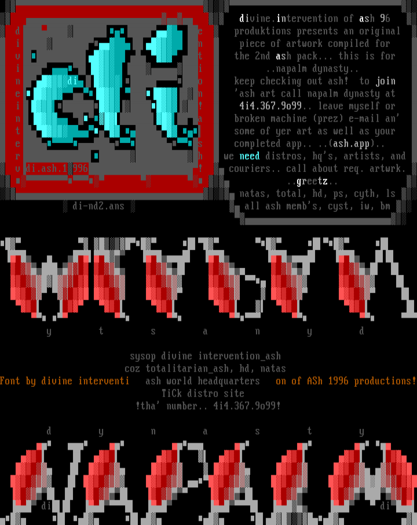 divine.intervention of ash 96 d e produktions presents an original i n piece of artwork compiled for v t the 2nd ash pack... this is for i i ..napalm dynasty.. ndio keep checking out ash! to join e n ash art call napalm dynasty at i! 4i4.367.9o99.. leave myself or n a broken machine prez e-mail an t some of yer art as well as your es completed app.. ..ash.app.. rh we need distros, hqs, artists, and vdi.ash.1996! couriers.. call about req. artwrk. ..greetz.. natas, total, hd, ps, cyth, ls di-nd2.ans all ash membs, cyst, iw, bm