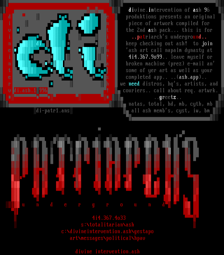 divine.intervention of ash 96 d e produktions presents an original i n piece of artwork compiled for v t the 2nd ash pack... this is for i i ..patriarchs underground.. ndio keep checking out ash! to join e n ash art call napalm dynasty at i! 4i4.367.9o99.. leave myself or n a broken machine prez e-mail an t some of yer art as well as your es completed app.. ..ash.app.. rh we need distros, hqs, artists, and vdi.ash.1996! couriers.. call about req. artwrk. ..greetz.. natas, total, hd, mb, cyth, mb di-patr1.ans all ash membs, cyst, iw, bm