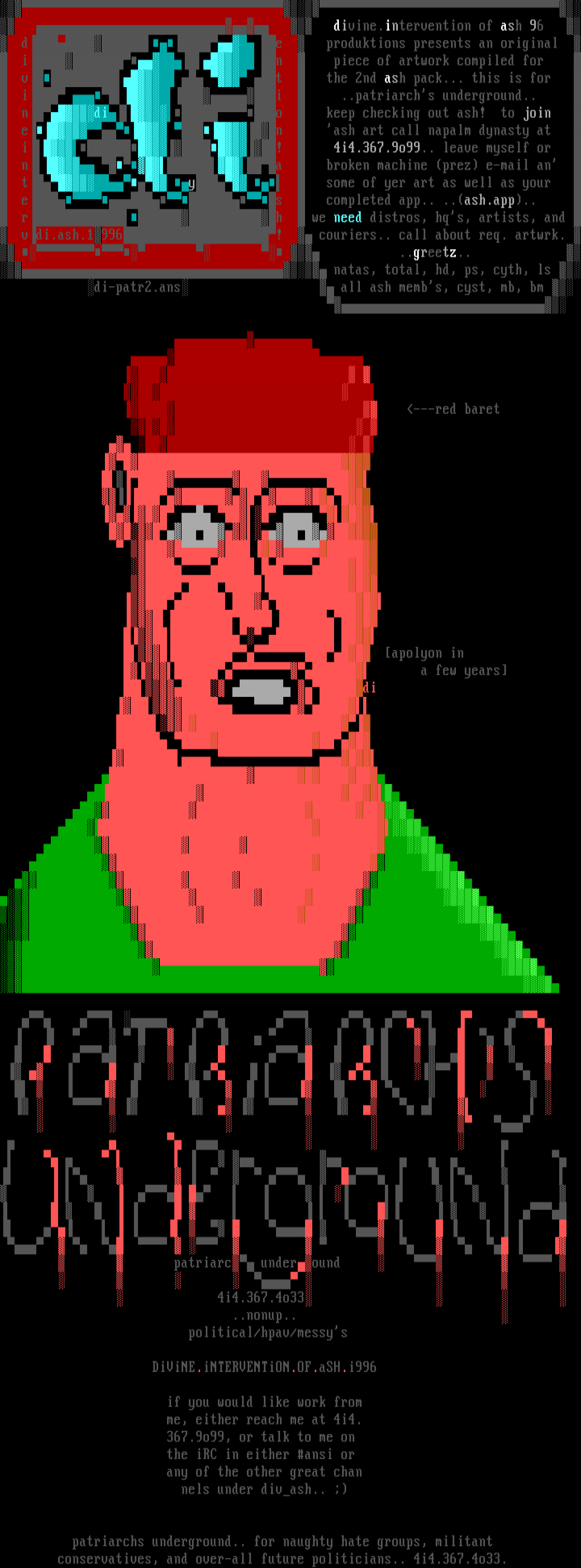 divine.intervention of ash 96 d e produktions presents an original i n piece of artwork compiled for v t the 2nd ash pack... this is for i i ..patriarchs underground.. ndio keep checking out ash! to join e n ash art call napalm dynasty at i! 4i4.367.9o99.. leave myself or n a broken machine prez e-mail an t y some of yer art as well as your es completed app.. ..ash.app.. rh we need distros, hqs, artists, and vdi.ash.1996! couriers.. call about req. artwrk. ..greetz.. natas, total, hd, ps, cyth, ls di-patr2.ans all ash membs, cyst, mb, bm