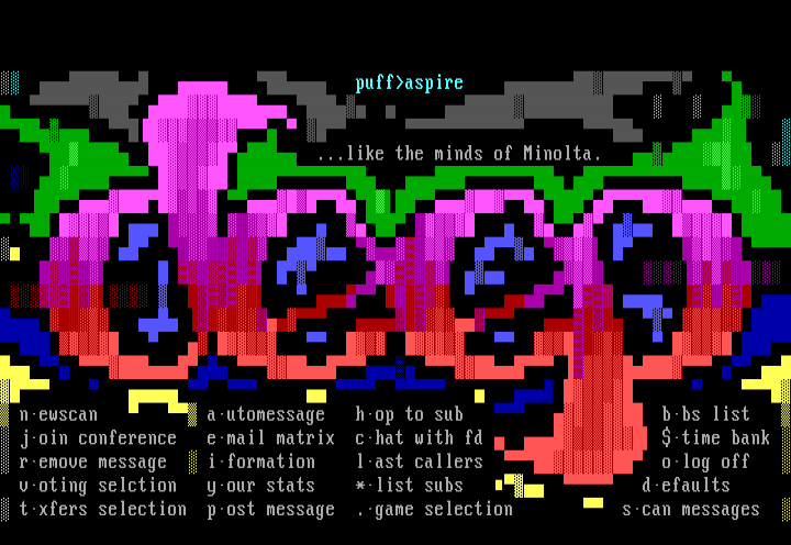 ...like the minds of Minolta. newscan automessage hop to sub bbs list join conference email matrix chat with fd time bank remove message iformation last callers olog off voting selction your stats *list subs defaults txfers selection post message .game selection scan messages