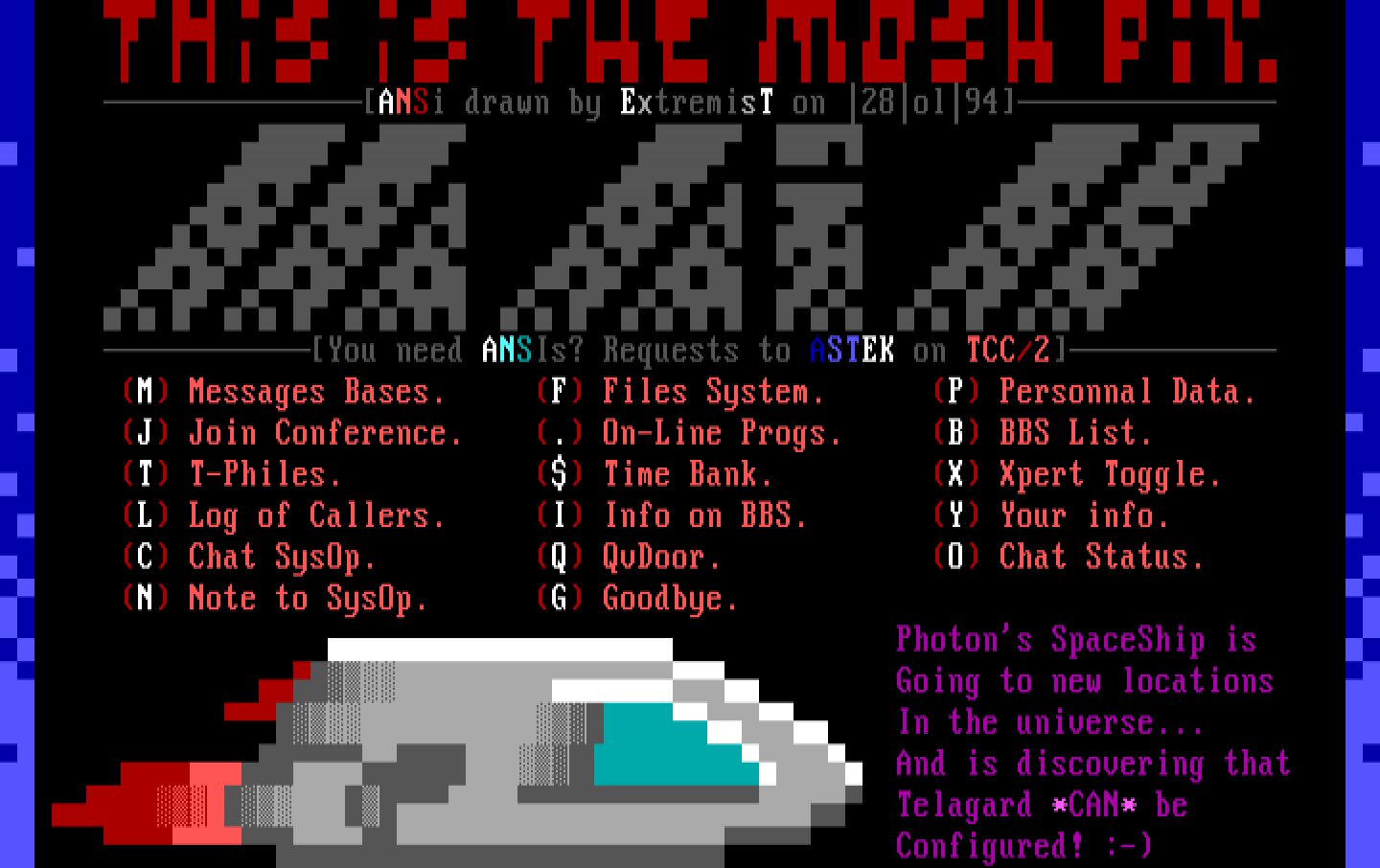 SysOp:Photon MMessagesBases. FFilesSystem. PPersonnalData. JJoinConference. .On-LineProgs. BBBSList. TT-Philes. TimeBank. XXpertToggle. LLogofCallers. IInfoonBBS. YYourinfo. CChatSysOp. QQvDoor. OChatStatus. NNotetoSysOp. GGoodbye. PhotonsSpaceShipis Goingtonewlocations Intheuniverse... Andisdiscoveringthat Telagard*CAN*be Configured!:- CoSysOps: The ExtremisT, Skyzofren, The Naughty Tycoon, DargothCAN CAN* ** * ANSi drawn by ExtremisT on 28ol94You need ANSIs? Requests to ASTEK on TCC/2