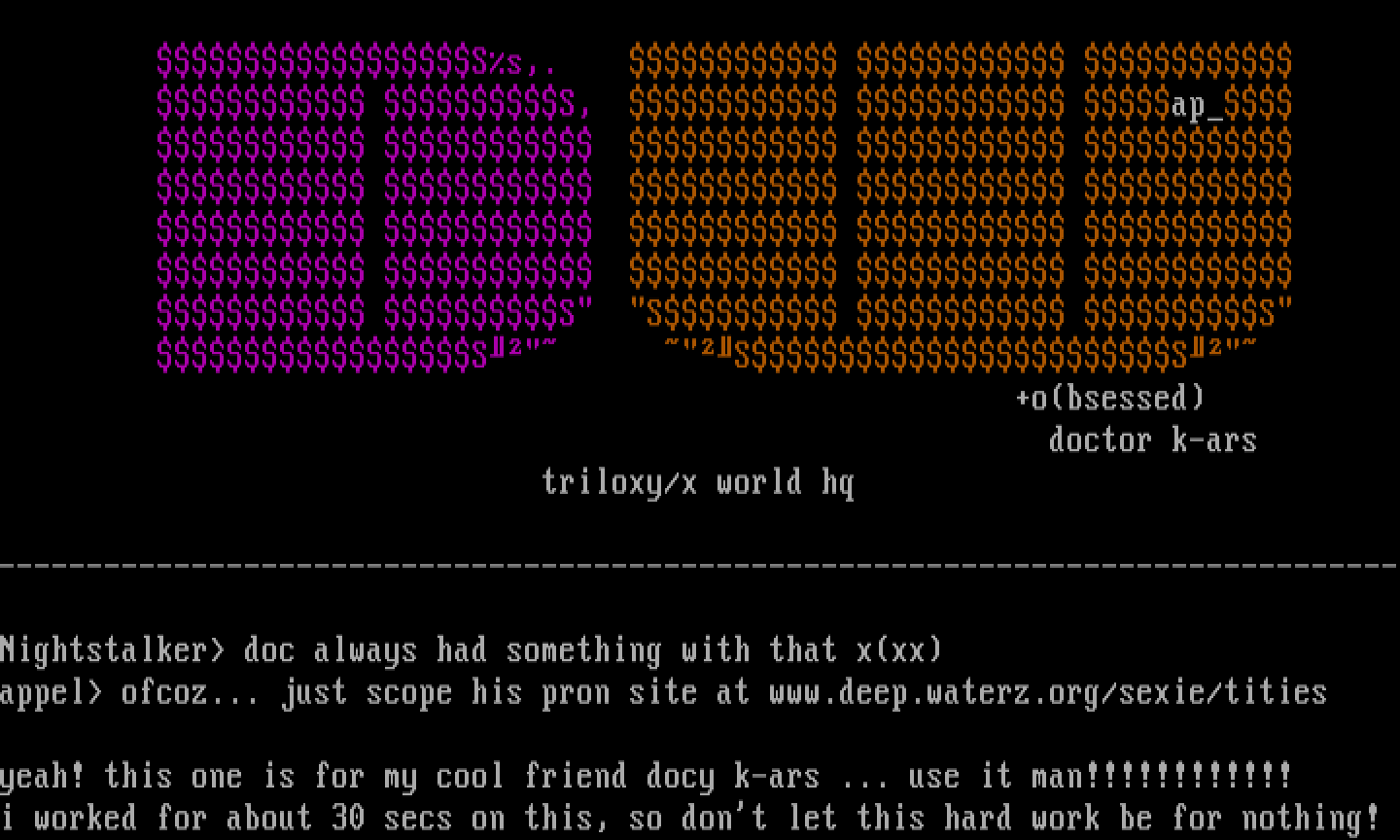 appel ofcoz... just scope his pron site at www.deep.waterz.org/sexie/tities