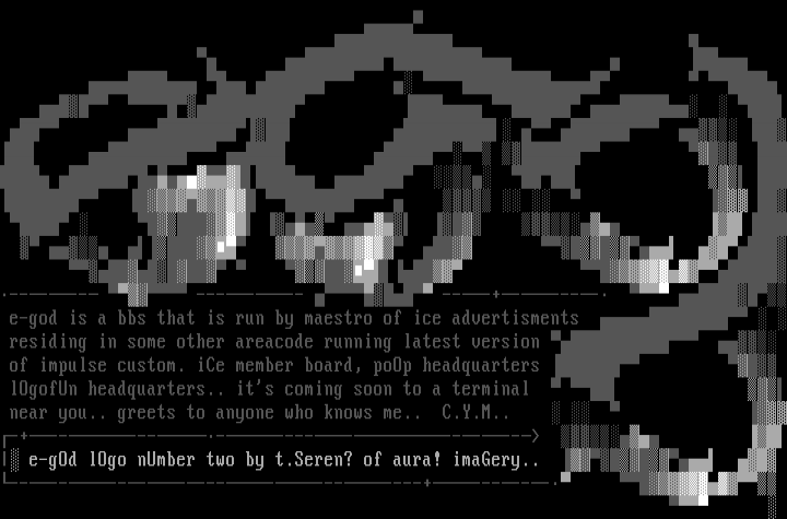 ----- ------ ---+----- e-god is a bbs that is run by maestro of ice advertisments residing in some other areacode running latest version