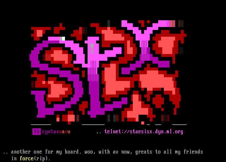 cyntaxaavv .. telnet://staesisx.dyn.ml.org