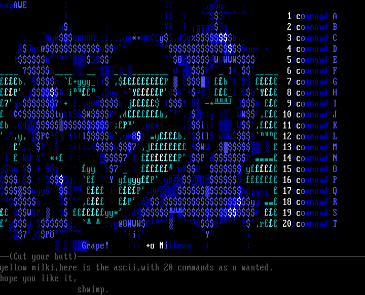 Cut your buttyellow milki,here is the ascii,with 20 commands as u wanted.