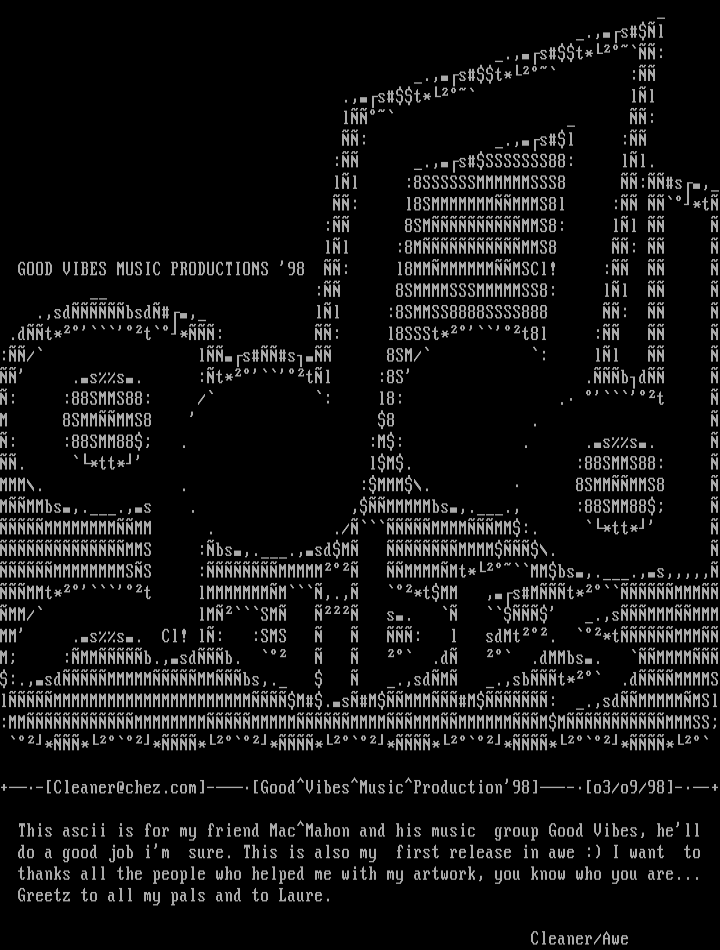 This ascii is for my friend MacMahon and his music group Good Vibes, hell