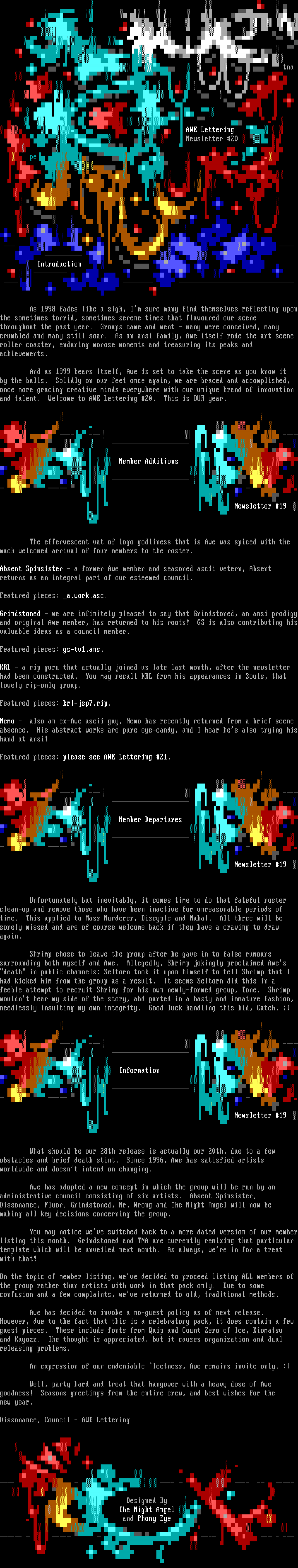 Grindstoned - we are infinitely pleased to say that Grindstoned, an ansi prodigyand original Awe member, has returned to his roots! GS is also contributing hisvaluable ideas as a council member.