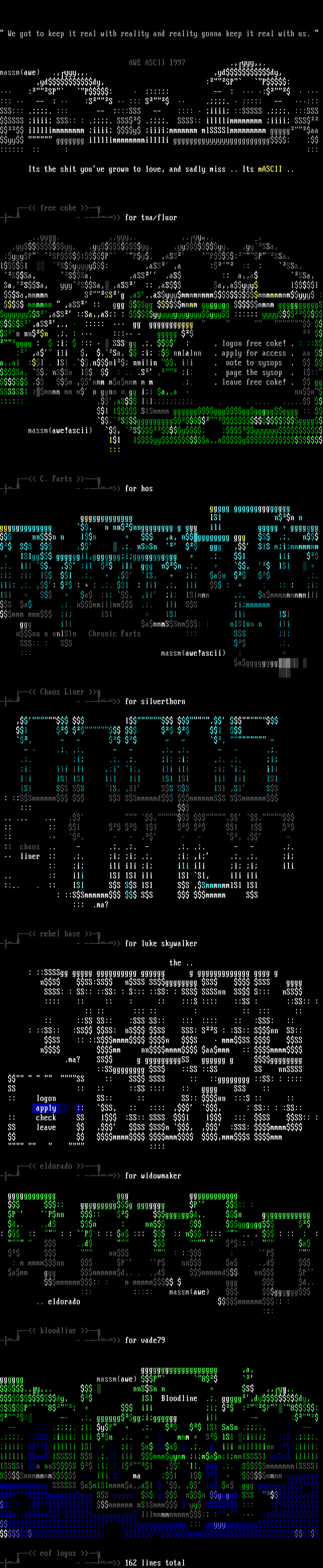 Sa,mmmmm SSSg ,aS.,aSyyymmmmmmmmmmmmmmmmyyy : mmmmmm ,aSS :: ggg Sgg mmmm ggggggg mmmm ggggggggggSyyyyyyS,aSS ::Sa,,aS:: : yyyyyyyyyyyyyyy :::::: yyyyS,aSS,., ::::: gg ggggggggggg Sn nnn .. : ::: ggggg gggg : i ::: SSS gg .. : . logon free coke! . : ::S ,a ili , ,Sa, i nnlalnn . apply for access . aa a,,al :l . lSl .,nnl nnilin , ili . note to sysops . Sa, , nSSn l : .. .S , i . page the sysop . l:: , m ,mmm mammm m m .. . leave free coke! . ggSSSSSSl mmmm mm m n ggnn n gg ii a,,a nnn:::::: ,,aS lil . . .... ..... l l SlSmmmm gggggggggggggggggggg :: ,Sggggggggggggg massmawe!ascii , Sy yyyyyy ll lyya,,ay :::