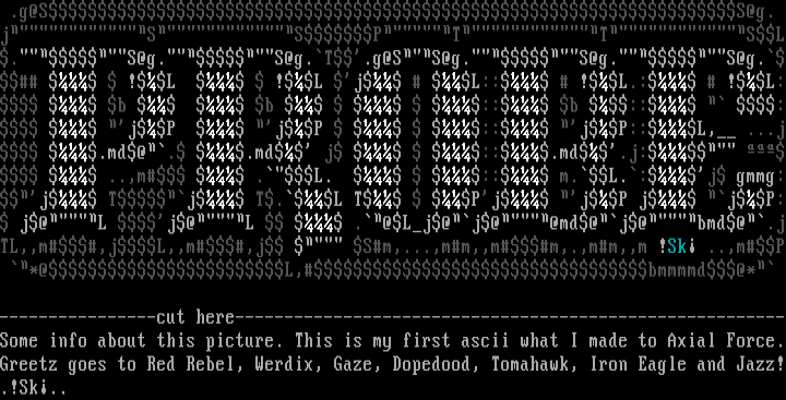 ----------------cut here--------------------------------------------------------Some info about this picture. This is my first ascii what I made to Axial Force.Greetz goes to Red Rebel, Werdix, Gaze, Dopedood, Tomahawk, Iron Eagle and Jazz!.!Sk..