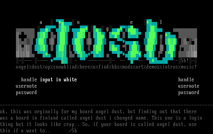 angeldustopsnowblindhereufindbbsmodsartdemosintrosmusic!