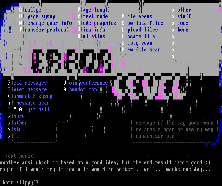 --cut here--------------------------------------------------------------------another ansi which is based on a good idea, but the end result isnt good :