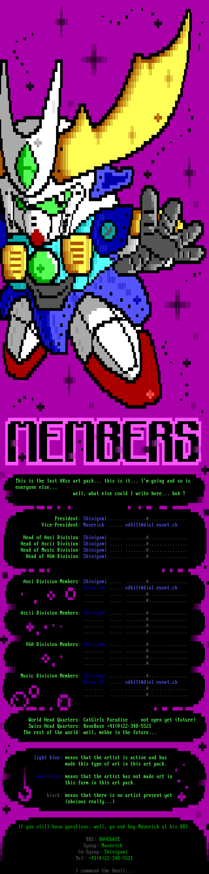 h h h h h h h h h hh h h h h h h h h h hh hh hh h .h h h h hh hh hh hh hh hh hh hhh This is the last AXss art pack... this is it... Im going and so is everyone else... well, what else could I write here... huh ? President: Shinigami ..... ........@............... Vice-President: Maverick ..... vdbilt@dial.eunet.ch Head of Ansi Division: Shinigami ..... ........@............... Head of Ascii Division: Shinigami ..... ........@............... Head of Music Division: Shinigami ..... ........@............... Head of VGA Division: Shinigami ..... ........@............... Ansi Division Members: Shinigami ..... ........@............... Maverick ..... vdbilt@dial.eunet.ch ........ ..... ........@............... ........ ..... ........@............... Ascii Division Members: Shinigami ..... ........@............... ........ ..... ........@............... ........ ..... ........@............... ........ ..... ........@............... VGA Division Members: Shinigami ..... ........@............... ........ ..... ........@............... ........ ..... ........@............... ........ ..... ........@............... Music Division Members: Shinigami ..... ........@............... Maverick ..... vdbilt@dial.eunet.ch ........ ..... ........@............... ........ ..... ........@............... World Head Quarters: CatGirls Paradise ... not open yet future Swiss Head Quarters: RaveBase +41022-348-5521 The rest of the world: well, mebbe in the future... light blue: means that the artist is active and has made this type of art in this art pack. dark blue: means that the artist has not made art in this form in this art pack. black: means that there is no artist present yet obvious really... If you still have questions, well, go and bug Maverick at his BBS.