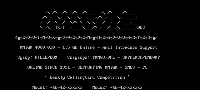 Sysop: RILLE/EQX Cosysops: TANGO/DPL - SKYFLASH/ONEWAY