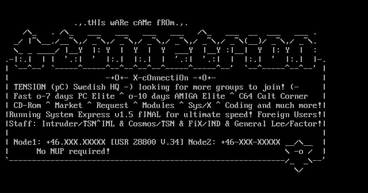 Node1: +46.XXX.XXXXX USR 28800 V.34 Node2: +46-XXX-XXXXX /