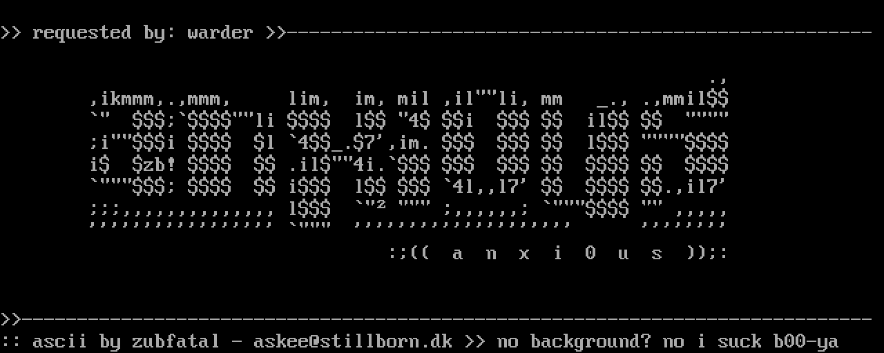 :: ascii by zubfatal - askee@stillborn.dk no background? no i suck b00-ya