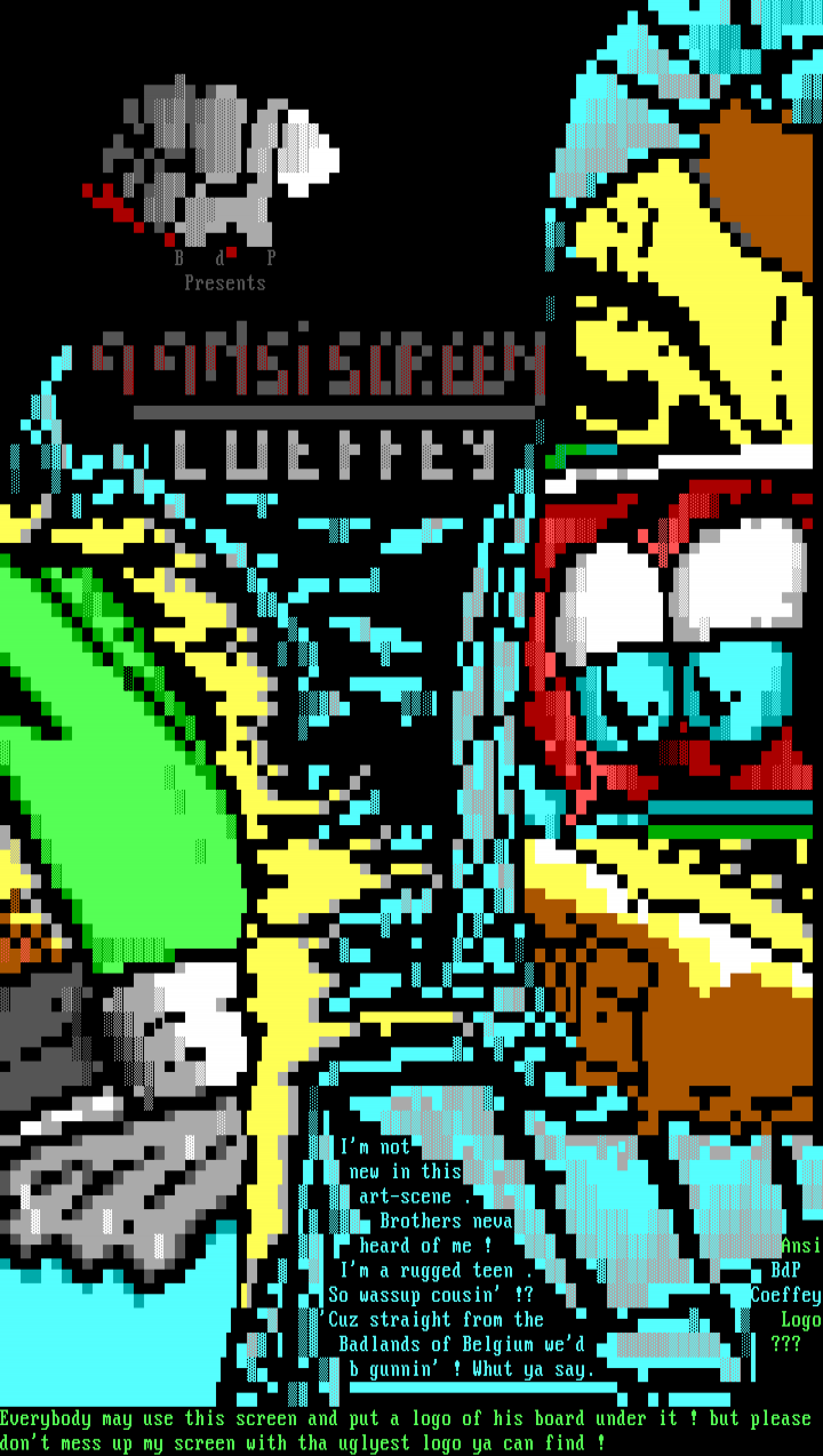 Brothers neva heard of me ! Ansi Im a rugged teen . BdP So wassup cousin !? Coeffey Cuz straight from the Logo Badlands of Belgium wed ??? b gunnin ! Whut ya say. Everybody may use this screen and put a logo of his board under it ! but please