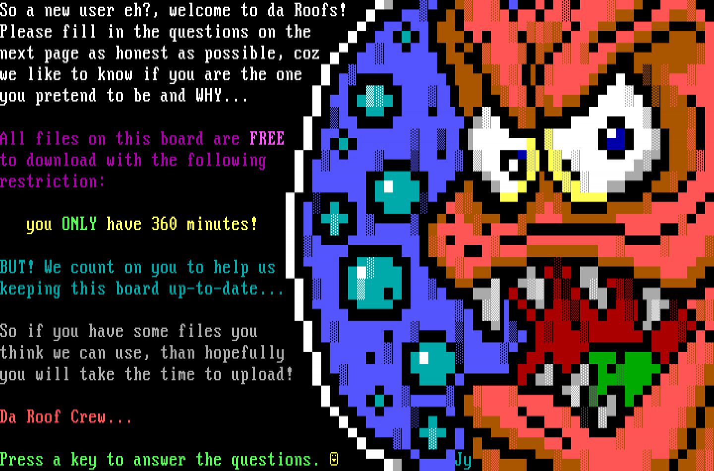 So a new user eh?, welcome to da Roofs! Please fill in the questions on the next page as honest as possible, coz we like to know if you are the one you pretend to be and WHY... All files on this board are FREE to download with the following restriction: you ONLY have 360 minutes!