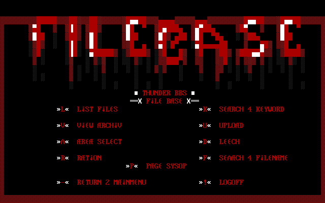 THUNDER BBS X FL BS X L LST FLS K SRCH 4 KYWORD V VW RCHV U UPLOD A R SLCT D LCH R RTON F SACH 4 FLNM P PG SYSOP - RTURN 2 MNMNU ! LOGOFF