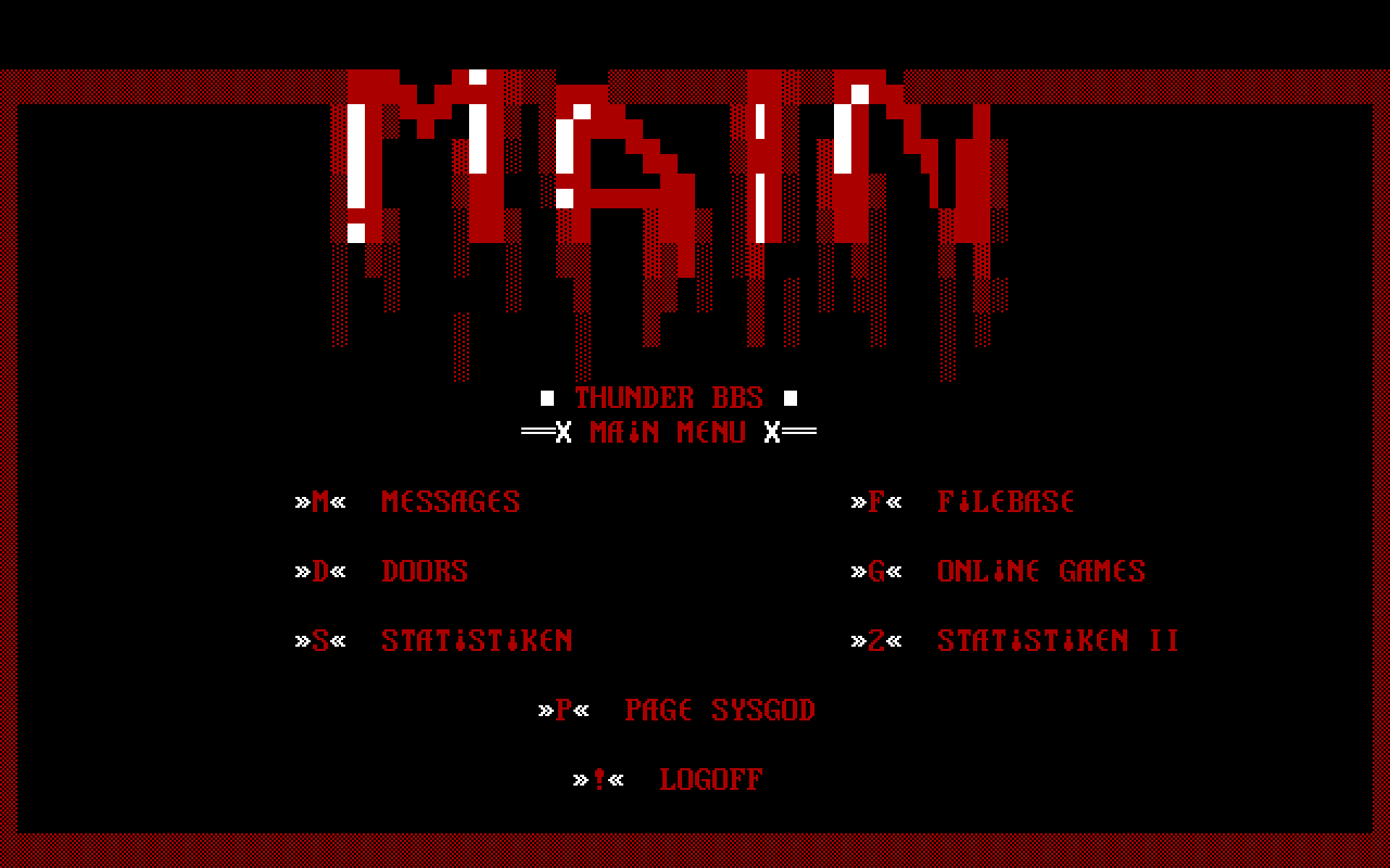 THUNDER BBS X MN MNU X M MSSGS F FLBS D DOORS G ONLN GMS S STTSTKN 2 STTSTKN II P PG SYSGOD ! LOGOFF