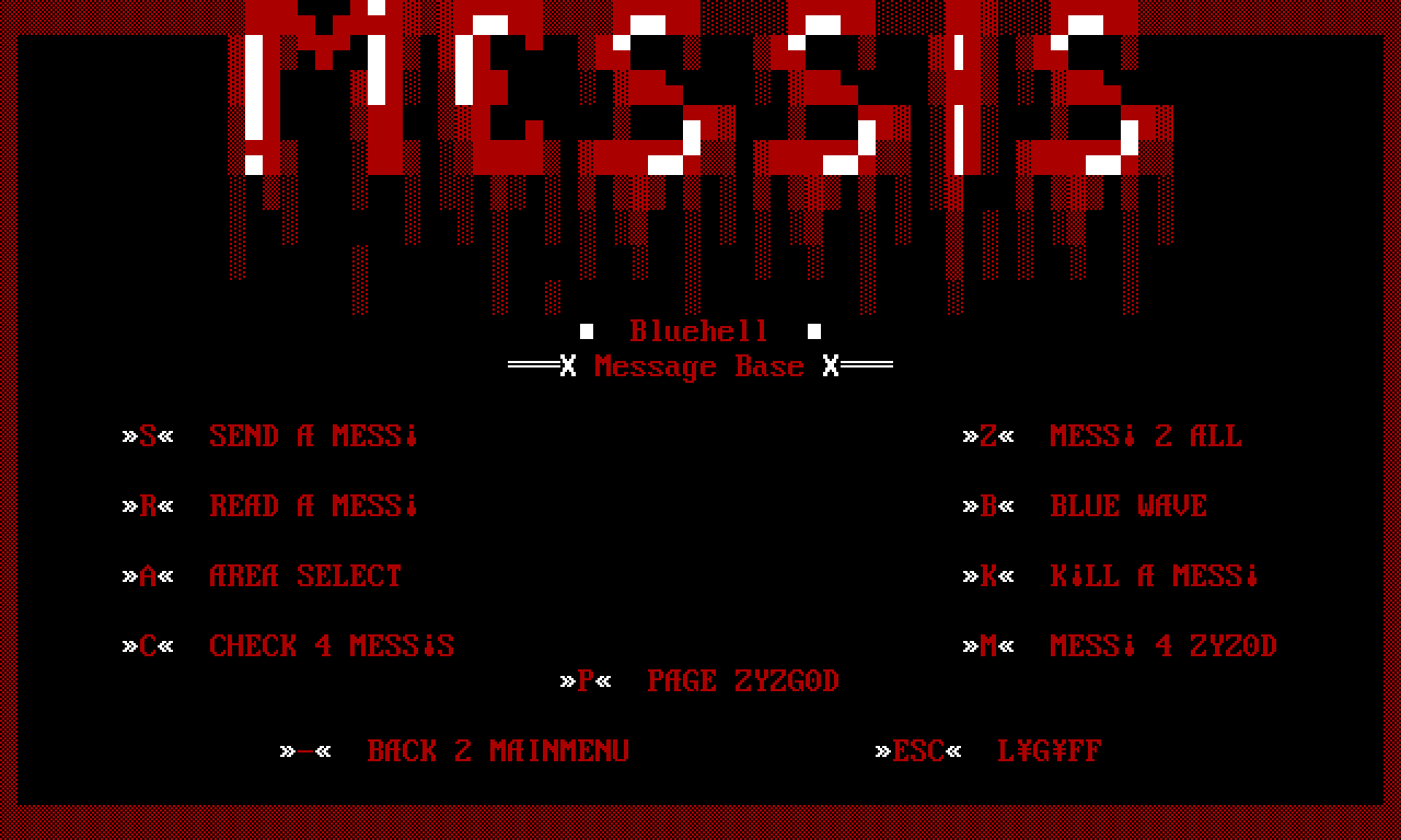 Bluehell X Message Base X S SEND MESS Z MESS 2 LL R RED MESS B BLUE WVE A RE SELECT K KLL MESS C CHECK 4 MESSS M MESS 4 ZYZ0D P PGE ZYZG0D - BCK 2 MINMENU ESC LGFF
