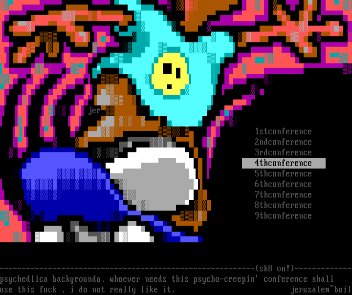 ----------------------------------------------------------sk8 on!-------------psychedlica backgrounda. whoever needs this psycho-creepin conference shall